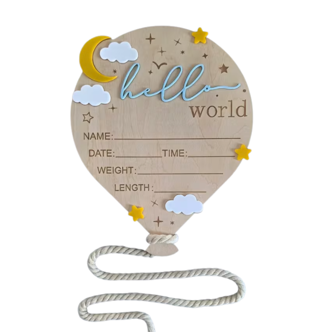 Tenerissima decorazione in legno a forma di mongolfiera pensata per celebrare la nascita di un neonato. Il delicato design con luna, nuvole e stelline e la scritta “Hello World” nei toni azzurri la rende perfetta come ricordo speciale dei primi momenti di vita.