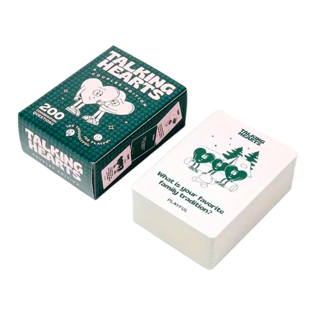 Riscopri il piacere di parlare, ascoltarsi e ridere insieme. Talking Hearts – Couples Edition è un gioco di carte pensato per le coppie che vogliono rafforzare il legame, conoscersi più a fondo o semplicemente condividere un momento speciale.
